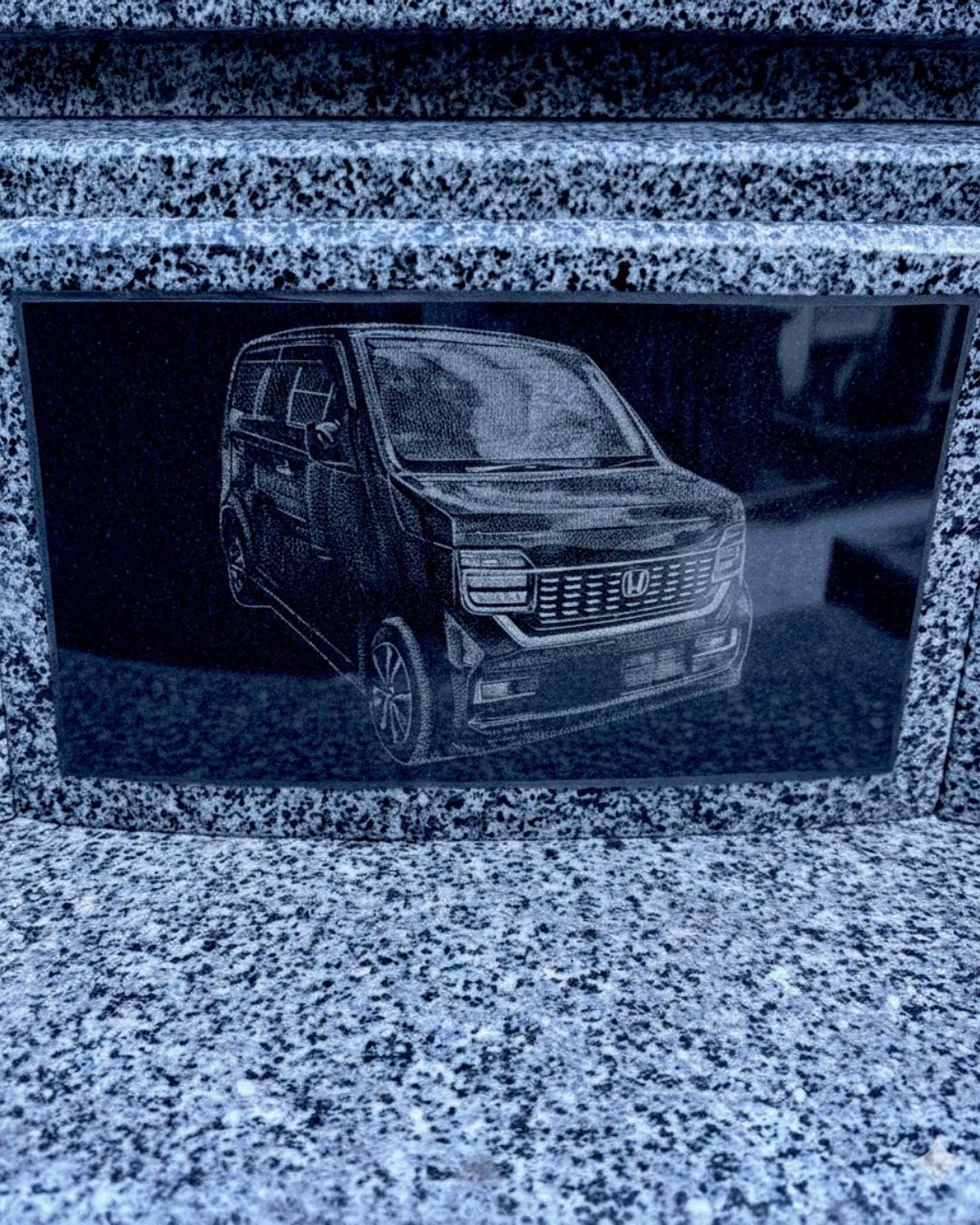 正面の文字はご家族でご相談の上、お決めになりました。故人様が大切にされていた車を彫刻し、想いを形にしています。