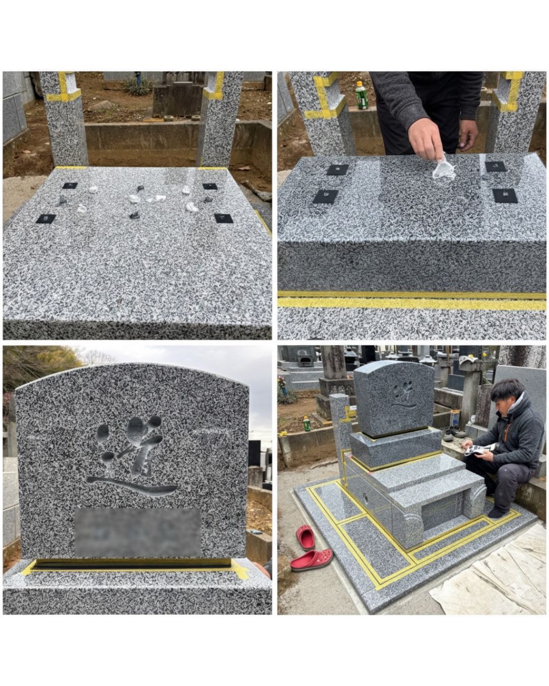 印西市にて新規墓所工事。施主様のご希望で、シンプルかつ落ち着いた色合い、お掃除しやすさにも配慮したお墓が完成しました。